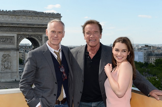 Director Alan Taylor and actors Arnold Schwarzenegger and Emilia Clarke pose during a photo call of “Terminator Genisys” in France’s Publicis Champs-Elysées. Photo: Dominique Charriau/Getty Images for Paramount Pictures.