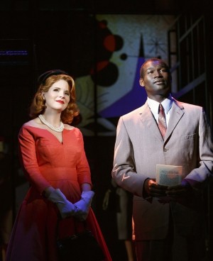 And then there is the cast. It is safe to say Kelli O’Hara is the reigning Queen of the Broadway Musical. As Cathy, she walks a tightrope between the breathless euphoria of the time and the deep disappointment that awaits her, but not until confronted with it head on, after unsuccessful psychiatric intervention and Frank leaving her for a man, does she know she is in free fall. Having gone off with the gardener for an innocent afternoon lunch, she is spurned by her suburban wife neighbors amid jokes that she is “nice to Negroes” (played with superb bitchiness, especially by Sarah Jane Shanks in the dual roles of Doreen and Connie, who turns the shirtwaist dress into a deadly social weapon) and, finally, even by the gardener who, because of the local hoopla over his “conversations” with Cathy, has to leave town. O’Hara cannot sing a note that doesn’t hit a listener in the solar plexus — you feel an immediate connection with whatever she is doing and an attendant empathy. She wears the rounded ’50s silhouette with perfect poise and again shows her range, as this role is so unlike, say, the waif she played in Light In The Piazza. She holds that stage in the final moments and brings the audience to their feet to rally around her. And so, with all the upheaval, in the end there is hope.