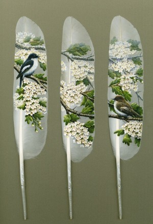 “Painting directly onto feathers brings with it a number of challenges: extensive feather preparation, sympathetic compositions for a small vertical canvas area, delicate brushwork directly onto the feather, and careful framing,” he said.