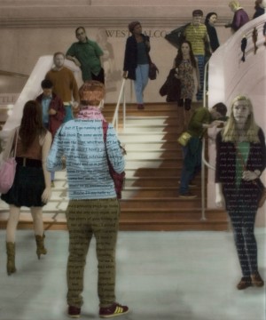 It was not until 2000 that Karver began writing text over some of her figures, “in an attempt to personalize or individualize them, and make them stand out from the crowd,” she says. The idea of adding stories came to Karver after printing a photograph from a newspaper she’d scanned and seeing the words from the reverse side come through in the photo. Writing about certain individuals on top of the figures themselves seemed the most logical to Karver, “it adds another layer, and gives the viewer a chance to “experience” the artwork, and become part of the process by reading it,” she explains. Giving a voice to her subjects through which viewers can more intimately relate, the superimposed descriptions are entirely fictitious, and often humorous in their candidly true-to-life insights.