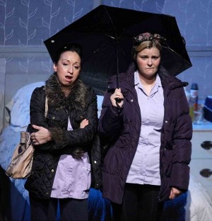 It’s hard to define why a dead man in the bathroom and two hysterical caseworkers trying to get a handle on this unwieldy situation is so unremittingly funny but in Jones’ script, it most decidedly is. It’s also a morality tale that pulls us into the playwright’s clutches and makes it our moral dilemma as well. Maybe if it were up to Loretta alone, she’d call in the doctor and the whole business would be done with. But she’s not alone, and as Frances is quick to advise her, Monday’s the day that Loretta picks up his pension from the ATM machine. If she doesn’t retrieve it on the same day, the government will gladly take it back. One hundred and twenty quid split between the two is nothing to sneeze at in a world where husbands are laid off for little reason and their wives clean up an old man’s waste for six quid an hour.