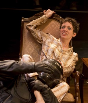 A former Victorian brothel, the house now serves as the temporary quarters of Roland and Elizabeth. At one end of the set, the designer has placed Elizabeth’s bedroom, the center ring is set as the third floor bedroom, with a slanted trapezoid overhang which establishes this as the attic room level. Dressed in rich burgundies and blues, with a generous pastiche of chandeliers, fringe lamps, settees, writing desks and carpeting, the set strikes just the right chord to suggest an alluring but seemingly haunted house. Cory Ryan Frank’s lighting is an intricate set-up, requiring fast speed transitions between the playing areas, as well as the vicissitudes of the weather. Kenra Rai’s costumes complement as well as amuse, particularly with the fanciful get-ups we expect of a flamboyant character like Elisabeth or a wild motorcycle hound like the loudmouthed Leslie.