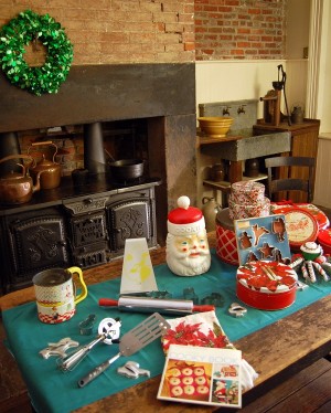 The amazingly preserved kitchen now boasts vintage Christmas cookie jars and utensils suggesting a ghostly cookie-making party. Old holiday records decorate the bright study room while holiday mugs, tablecloth and a miniature tinsel tree liven up the dining room. The large artificial tree in the front parlor ties together the house’s retro holiday cheer.
