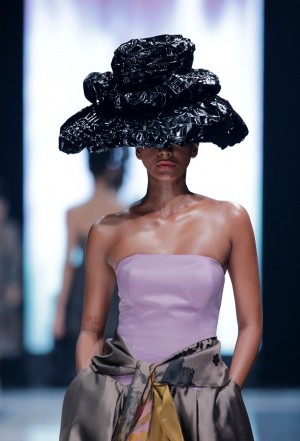 One show of particular note was Oscar Lawalata’s. Despite the confusion wrought by the unexpected storm, his show on November 4 was glitzy stopgap that saved the week when events from the ruined tent were moved into a nearby shopping mall — meaning models had to walk across a catwalk an unbelievable four meters high.