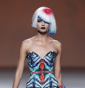 But things really kicked into high gear the night of the 15th, when at 7 p.m. Maya Hansen presented her “Pangea” collection, using rigid materials to give shape to the body for an out-of-this-world effect — literally. Jane Jetson meets Lady Gaga meets Louise Brooks was among the first things that came to viewers’ minds in a stunning show that practically brought the house down with its sheer level of daring. Rorschach Test-style prints that capture an onlooker’s gaze and refuse to relinquish it, puffed sleeves boasting a wicked couture flavor, dresses with enough ruffles to hide an entire army, and models with fierce bob cuts in all colors of the rainbow (sometimes all at once, and in stunning gradients to boot) with frosted puts got pulses racing for the span of 20 looks. It was a fashion fete that made one all but forget that Madrid is miles away from Spain’s famous beaches, or even that humans don’t yet live on Mars.