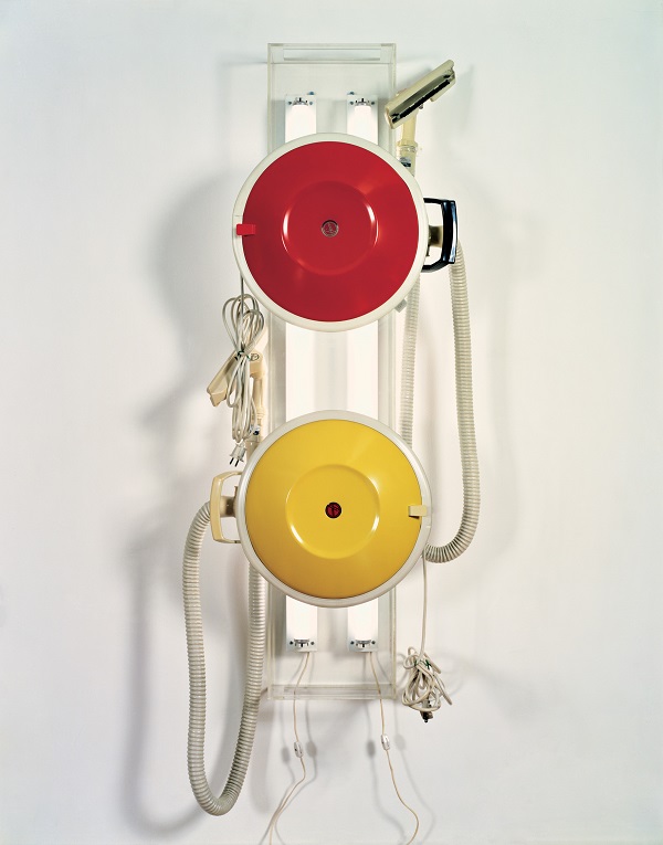 Jeff Koons, “New Hoover Celebrity III’s,” 1980. Two vacuum cleaners, Plexigas, fluorescent lights; 56 x 11 x 12 1/2 in. (142.2 x 27.9 x 31.8 cm). Collection of Jeffrey Deitch. ©Jeff Koons. Photo courtesy of the Whitney Museum of American Art.