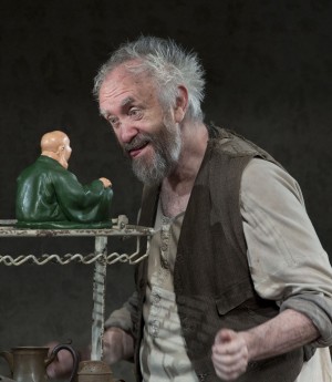 A tramp has wandered onto the stage of BAM’s Harvey Theater. His tattered shoes fit poorly, tufts of his hair stick up, and you can practically smell the stink rising off of his unwashed body. He’s the type of man who you might slink past to the other end of a subway car to avoid. And in this production of Harold Pinter’s seminal play The Caretaker, two-time Tony Award-winning actor Jonathan Pryce deftly embodies him in a performance that ping-pongs back and forth between humorous and harrowing.