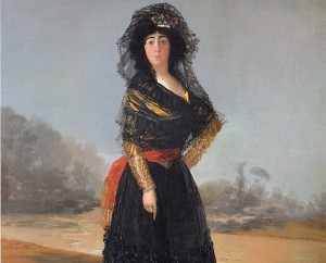 To find the answer, I needed to start at the source: the Mourning Portrait of Maria del Pilar Teresa Cayetana de Silva-Alvarez de Toledo, more commonly known as the 13th Duchess of Alba. This 1797 portrait rests on the facing wall of the main inner court as you first enter. She immediately catches the eye, in her proud elbow on hip stance, before you can even take in the rest of the magnificent interior with its burnt orange walls and dark wood balcony that rings the room. One thing’s for certain. The lady in the painting is a self-possessed 35-year-old woman of great bearing, and from her posture, the only thing in mourning appears to be the swirling black lace of the dress itself.