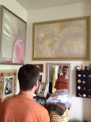He showed me to his children’s room where a vibrantly colored, ambiguous sunset beamed on the wall. Sandwiched between the wall and this painting hung a second pink painting resembling leaves specked with dew, ranging from powdery to rosy to fuchsia pink shades. His entire apartment resembled this room: walls nearly collapsing with rainbows of color and canvas.