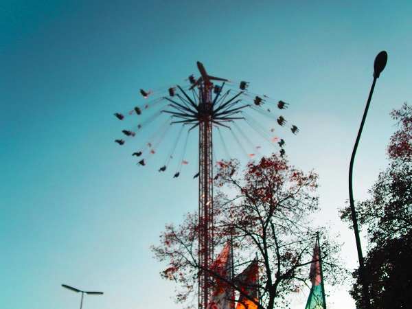 Darkness now blanketed the sky, but the beer garden was still bright courtesy of hundreds of lamps and the luminescent glow of roller-coasters, Ferris Wheels, tilt-a-whirls, and other amusement park-style rides that towered nearby that are also a prominent feature of Oktoberfest. Blood pressure spiking with each bite of the doughy, salt-encrusted pretzel, I was beginning to think that Oktoberfest was more like a New England county fair on steroids than anything else, a gigantic spectacle that somehow has maintained a smallish, old-timey feel.